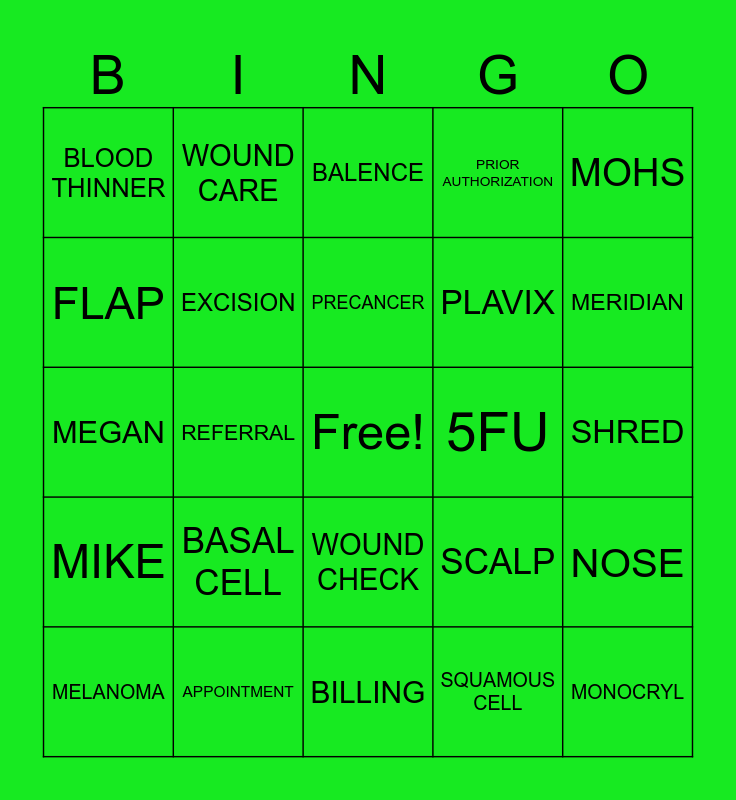 This bingo card has a free space and 53 words: SRT, MONOCRYL, VICRYL, SQUAMOUS CELL, BASAL CELL, CEPHALEXIN, WOUND CARE, WOUND CHECK, FLAP, GRAFT, EXCISION, MAP, NOSE, SCALP, LEG, MELANOMA, PRECANCER, 5FU, DOXYCYCLINE, MOHS, REFERRAL, ELIQUIS, PLAVIX, BLOOD THINNER, INSURANCE, APPOINTMENT, LATE, NO SHOW, MEDICAID, MERIDIAN, BLUE CROSS COMMUNITY, AETNA, MEDICARE, HMO, PPO, REFERRAL, PRIOR AUTHORIZATION, BILLING, BALENCE, FOLLOW UP, CLINICAL, PHONE CALL, SHRED, PAYOR GRID, PROCEDURE, WOUND CHECK, POLANSKY, JEAN-BAPTISTE, MEGAN, MIKE, AMY, KYLEE and SUTURE REMOVAL.