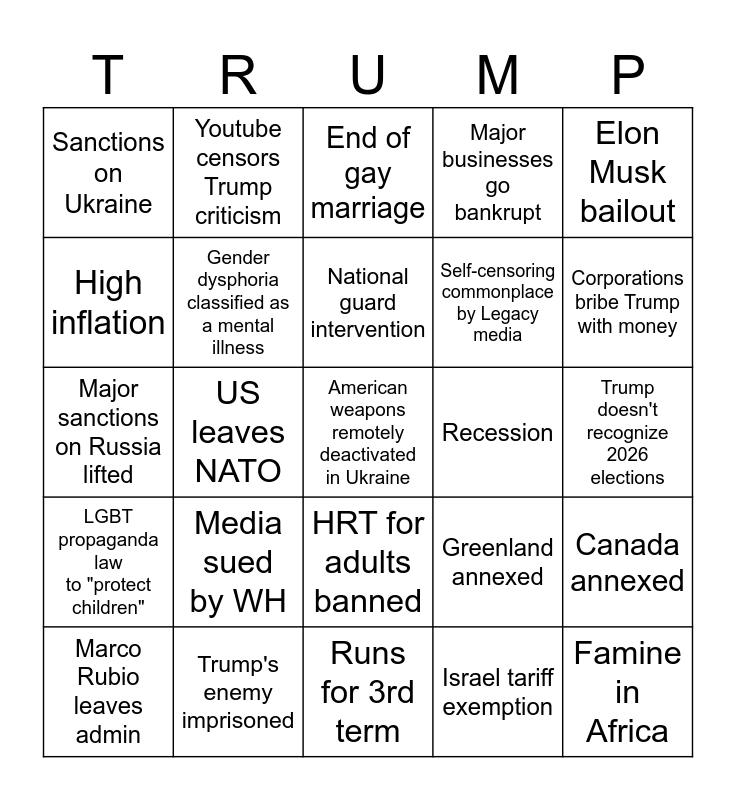 This bingo card has 25 words: Media sued by WH, Runs for 3rd term, National guard intervention, Marco Rubio leaves admin, Elon Musk bailout, Sanctions on Ukraine, High inflation, Youtube censors Trump criticism, Recession, HRT for adults banned, Self-censoring commonplace by Legacy media, Major sanctions on Russia lifted, Greenland annexed, Canada annexed, Gender dysphoria classified as a mental illness, Famine in Africa, Trump doesn't recognize 2026 elections, End of gay marriage, Corporations bribe Trump with money, US leaves NATO, American weapons remotely deactivated in Ukraine, Trump's enemy imprisoned, LGBT propaganda law to "protect children", Major businesses go bankrupt and Israel tariff exemption.