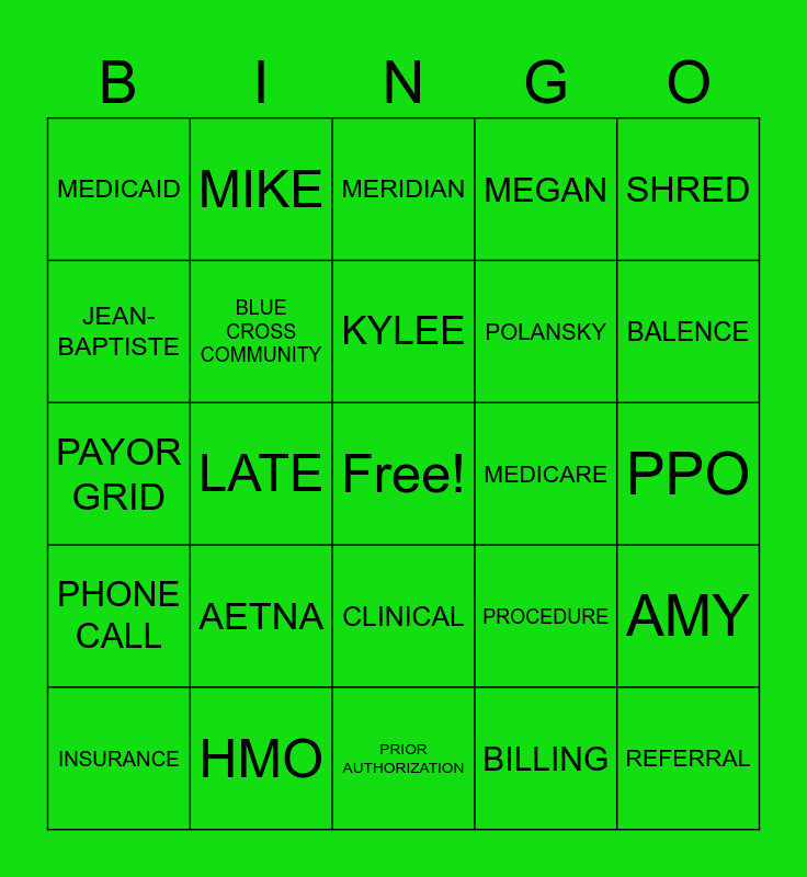 This bingo card has a free space and 29 words: INSURANCE, APPOINTMENT, LATE, NO SHOW, MEDICAID, MERIDIAN, BLUE CROSS COMMUNITY, AETNA, MEDICARE, HMO, PPO, REFERRAL, PRIOR AUTHORIZATION, BILLING, BALENCE, FOLLOW UP, CLINICAL, PHONE CALL, SHRED, PAYOR GRID, PROCEDURE, WOUND CHECK, POLANSKY, JEAN-BAPTISTE, MEGAN, MIKE, AMY, KYLEE and SUTURE REMOVAL.