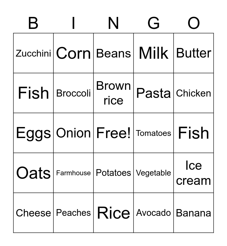 This bingo card has a free space and 24 words: Farmhouse, Peaches, Brown rice, Cheese, Butter, Zucchini, Fish, Corn, Tomatoes, Potatoes, Pasta, Eggs, Vegetable, Ice cream, Broccoli, Avocado, Fish, Beans, Chicken, Onion, Banana, Oats, Milk and Rice.