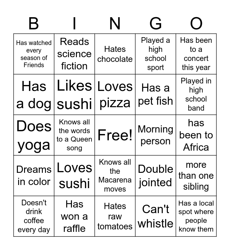 This bingo card has a free space and 24 words: Loves sushi, Has won a raffle, Loves pizza, Doesn't drink coffee every day, Has been to a concert this year, Has watched every season of Friends, Has a dog, Reads science fiction, Morning person, Knows all the Macarena moves, Has a pet fish, Does yoga, Double jointed, more than one sibling, Likes sushi, Can't whistle, has been to Africa, Hates chocolate, Played in high school band, Knows all the words to a Queen song, Has a local spot where people know them, Dreams in color, Played a high school sport and Hates raw tomatoes.