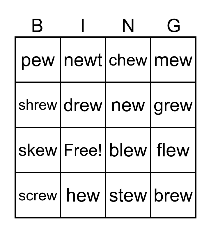 This bingo card has 18 words: Free!, brew, chew, pew, blew, mew, screw, newt, grew, skew, stew, shrew, flew, drew, new, stew, hew and hewn.
