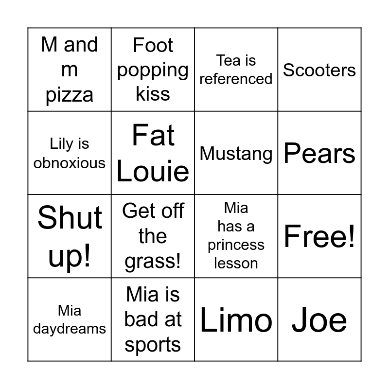 This bingo card has 20 words: Free!, Josh is a show off, Tea is referenced, Geniovia is mentioned, Mia daydreams, Lily is obnoxious, Mia is bad at sports, M and m pizza, Shut up!, Foot popping kiss, Get off the grass!, Mia has a princess lesson, Fat Louie, Joe, Mustang, Rock Climbing, Pears, Scooters, Limo and Miss Gupta.