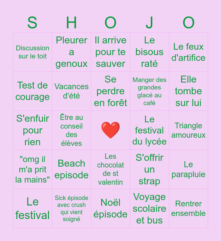 This bingo card has a free space and 24 words: Beach episode, Sick épisode avec crush qui vient soigné, Se perdre en forêt, Le festival, Le feux d'artifice, Discussion sur le toit, Test de courage, Pleurer a genoux, Le festival du lycée, Les chocolat de st valentin, Manger des grandes glacé au café, S'enfuir pour rien, S'offrir un strap, Le parapluie, Vacances d'été, Voyage scolaire et bus, Triangle amoureux, Il arrive pour te sauver, Elle tombe sur lui, Être au conseil des élèves, Rentrer ensemble, "omg il m'a prit la mains", Le bisous raté and Noël épisode.