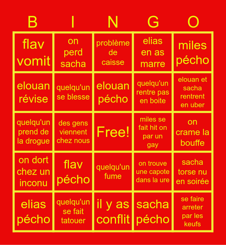 This bingo card has a free space and 24 words: elias pécho, flav pécho, elouan pécho, sacha pécho, miles pécho, flav vomit, on perd sacha, problème de caisse, miles se fait hit on par un gay, on crame la bouffe, quelqu'un prend de la drogue, quelqu'un se blesse, on trouve une capote dans la ure, sacha torse nu en soirée, elouan révise, quelqu'un se fait tatouer, il y as conflit, elias en as marre, elouan et sacha rentrent en uber, on dort chez un inconu, des gens viennent chez nous, quelqu'un fume, quelqu'un rentre pas en boite and se faire arreter par les keufs.
