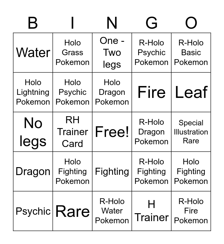 This bingo card has a free space and 49 words: Holo Fire pokemon, R-Holo Fire Pokemon, Holo Water Pokemon, R-Holo Water Pokemon, Holo Fighting Pokemon, R-Holo Fighting Pokemon, Holo Grass Pokemon, R-Holo Grass Pokemon, Holo Lightning Pokemon, R-Holo Lightning Pokemon, Holo Psychic Pokemon, R-Holo Psychic Pokemon, Holo Fighting Pokemon, R-Holo Fighting Pokemon, Holo Dark Pokemon, R-Holo Dark Pokemon, Holo Dragon Pokemon, R-Holo Dragon Pokemon, Holo Basic Pokemon, R-Holo Basic Pokemon, RH Trainer Card, H Trainer, Water, Fire, Lightning, Leaf, Psychic, Dark, Fighting, Dragon, Metal, Full Art Trainer, Rainbow Border, Ace Spec, Rare, Double Rare, Ultra Rare, Illustration Rare, Special Illustration Rare, Hyper Rare, Multiple Pokemon, Has Wings, Swimming, Flying, No legs, One - Two legs, >Two legs, Gold Card and Pokeball.