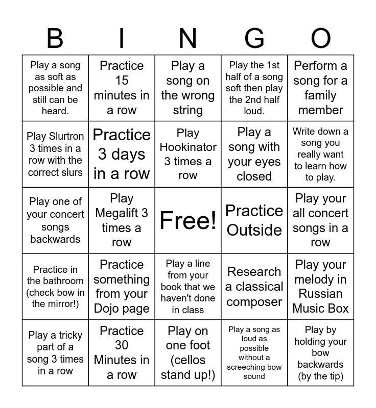 This bingo card has a free space and 24 words: Practice something from your Dojo page, Practice 30 Minutes in a row, Play Hookinator 3 times a row, Play a tricky part of a song 3 times in a row, Perform a song for a family member, Play a song as soft as possible and still can be heard., Play Slurtron 3 times in a row with the correct slurs, Practice 15 minutes in a row, Practice Outside, Play a line from your book that we haven't done in class, Play a song with your eyes closed, Play one of your concert songs backwards, Research a classical composer, Play your melody in Russian Music Box, Practice 3 days in a row, Play a song as loud as possible without a screeching bow sound, Play your all concert songs in a row, Play a song on the wrong string, Write down a song you really want to learn how to play., Play Megalift 3 times a row, Play by holding your bow backwards (by the tip), Practice in the bathroom (check bow in the mirror!), Play the 1st half of a song soft then play the 2nd half loud. and Play on one foot (cellos stand up!).