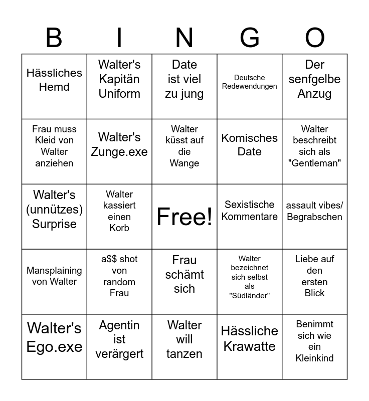 This bingo card has a free space and 24 words: Walter's Ego.exe, a$$ shot von random Frau, Walter küsst auf die Wange, Hässliche Krawatte, Der senfgelbe Anzug, Hässliches Hemd, Walter's Kapitän Uniform, Date ist viel zu jung, Sexistische Kommentare, assault vibes/ Begrabschen, Walter's (unnützes) Surprise, Walter's Zunge.exe, Walter bezeichnet sich selbst als "Südländer", Liebe auf den ersten Blick, Frau muss Kleid von Walter anziehen, Agentin ist verärgert, Walter will tanzen, Deutsche Redewendungen, Walter beschreibt sich als "Gentleman", Mansplaining von Walter, Walter kassiert einen Korb, Frau schämt sich, Komisches Date and Benimmt sich wie ein Kleinkind.