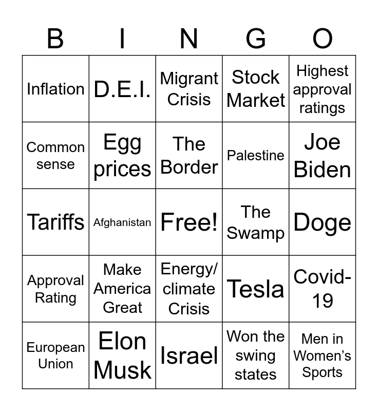 This bingo card has a free space and 24 words: Make America Great, Elon Musk, The Border, European Union, Highest approval ratings, Inflation, Common sense, D.E.I., The Swamp, Energy/ climate Crisis, Palestine, Tariffs, Tesla, Covid-19, Egg prices, Won the swing states, Doge, Migrant Crisis, Joe Biden, Afghanistan, Men in Women’s Sports, Approval Rating, Stock Market and Israel.