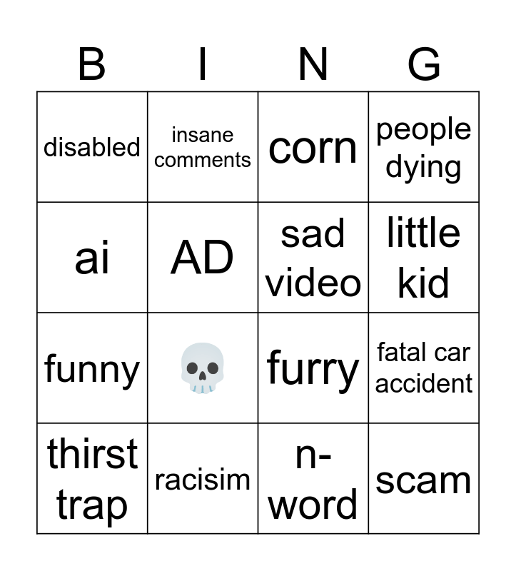 This bingo card has 16 words: racisim, fatal car accident, corn, disabled, funny, insane comments, furry, n-word, ai, AD, thirst trap, people dying, 💀, little kid, sad video and scam.