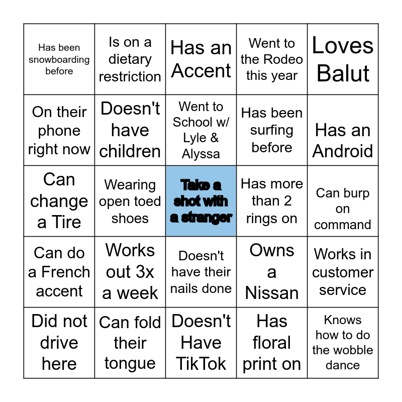 This bingo card has a free space and 24 words: Works out 3x a week, Can fold their tongue, Went to School w/ Lyle & Alyssa, Did not drive here, Loves Balut, Has been snowboarding before, On their phone right now, Is on a dietary restriction, Has more than 2 rings on, Doesn't have their nails done, Has been surfing before, Can change a Tire, Owns a Nissan, Works in customer service, Doesn't have children, Has floral print on, Can burp on command, Has an Accent, Has an Android, Wearing open toed shoes, Knows how to do the wobble dance, Can do a French accent, Went to the Rodeo this year and Doesn't Have TikTok.