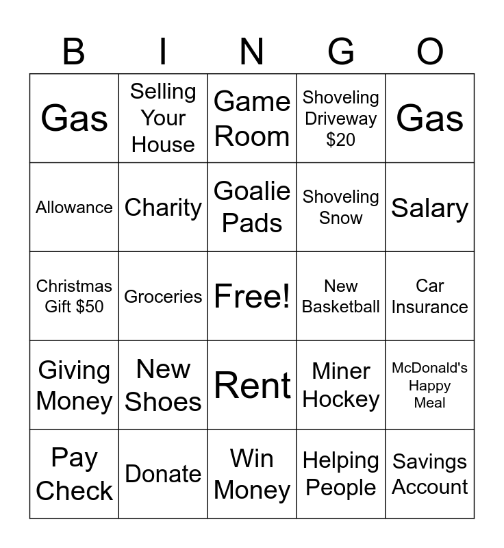 This bingo card has a free space and 24 words: New Shoes, Donate, Goalie Pads, Pay Check, Gas, Gas, Allowance, Selling Your House, New Basketball, Rent, Shoveling Snow, Christmas Gift $50, Miner Hockey, McDonald's Happy Meal, Charity, Helping People, Car Insurance, Game Room, Salary, Groceries, Savings Account, Giving Money, Shoveling Driveway $20 and Win Money.