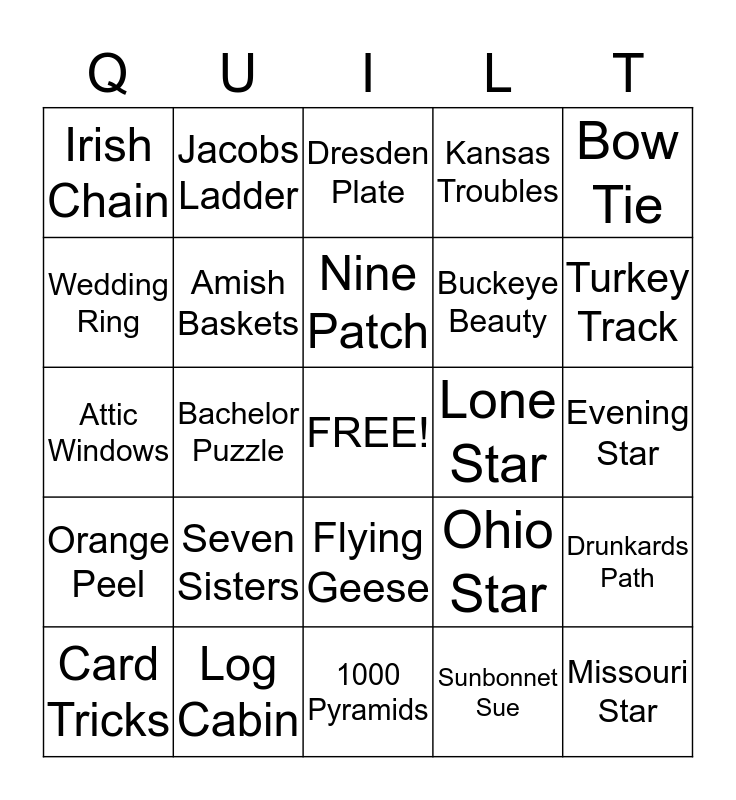 This bingo card has a free space and 24 words: Seven Sisters, Log Cabin, Nine Patch, Card Tricks, Bow Tie, Irish Chain, Wedding Ring, Jacobs Ladder, Lone Star, Flying Geese, Buckeye Beauty, Attic Windows, Ohio Star, Drunkards Path, Amish Baskets, Sunbonnet Sue, Evening Star, Dresden Plate, Turkey Track, Bachelor Puzzle, Missouri Star, Orange Peel, Kansas Troubles and 1000 Pyramids.