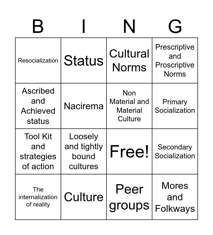 This bingo card has 21 words: Culture, Cultural Boundaries, Status, Values, Peer groups, Non Material and Material Culture, Resocialization, Cultural Norms, Free!, Primary Socialization, Tool Kit and strategies of action, Prescriptive and Proscriptive Norms, Mores and Folkways, Socialization, Nacirema, Total institutions, The internalization of reality, Loosely and tightly bound cultures, Ascribed and Achieved status, Secondary Socialization and Subculture and Counter-Culture.