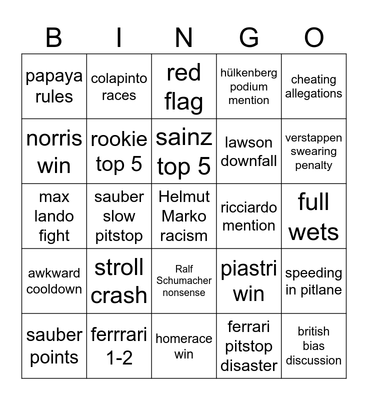 This bingo card has a free space and 24 words: stroll crash, ferrrari 1-2, sainz top 5, sauber points, cheating allegations, papaya rules, norris win, colapinto races, ricciardo mention, Ralf Schumacher nonsense, lawson downfall, max lando fight, piastri win, speeding in pitlane, rookie top 5, ferrari pitstop disaster, full wets, red flag, verstappen swearing penalty, sauber slow pitstop, british bias discussion, awkward cooldown, hülkenberg podium mention and homerace win.