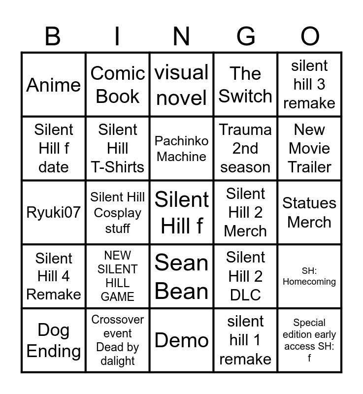 This bingo card has a free space and 24 words: NEW SILENT HILL GAME, Crossover event Dead by dalight, Pachinko Machine, Dog Ending, silent hill 3 remake, Anime, Silent Hill f date, Comic Book, Silent Hill 2 Merch, Sean Bean, Trauma 2nd season, Ryuki07, Silent Hill 2 DLC, SH: Homecoming, Silent Hill T-Shirts, silent hill 1 remake, Statues Merch, visual novel, New Movie Trailer, Silent Hill Cosplay stuff, Special edition early access SH: f, Silent Hill 4 Remake, The Switch and Demo.