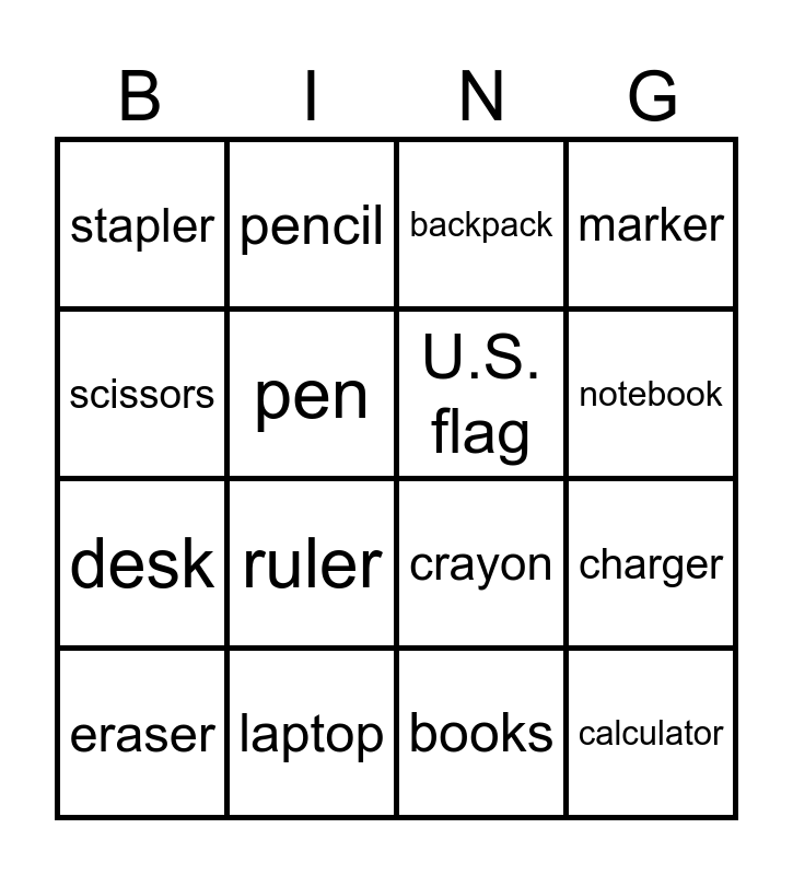 This bingo card has 16 words: laptop, charger, backpack, stapler, desk, pencil, crayon, books, scissors, pen, eraser, marker, ruler, notebook, U.S. flag and calculator.