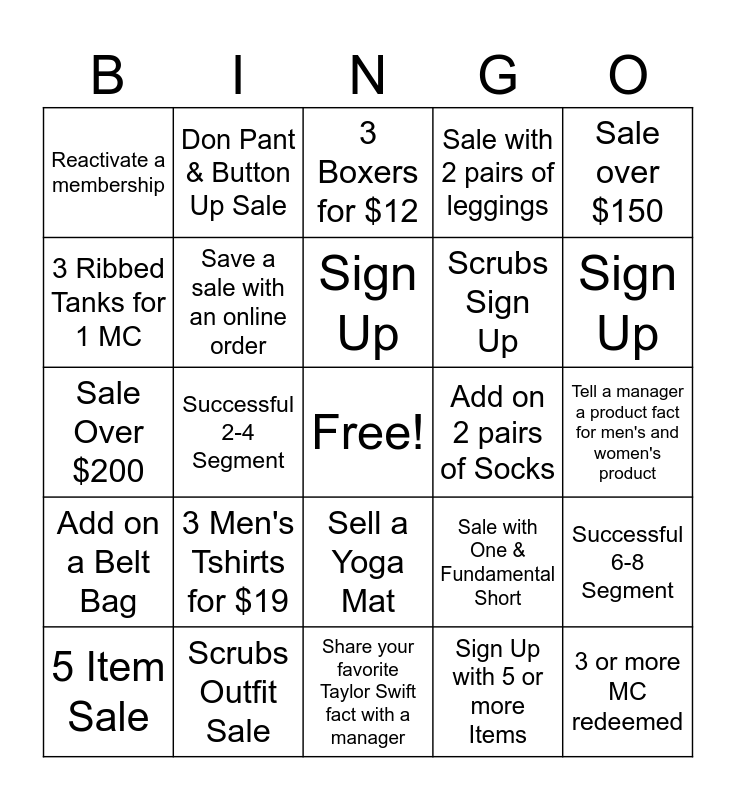 This bingo card has a free space and 24 words: 3 Men's Tshirts for $19, Scrubs Outfit Sale, Sign Up, 5 Item Sale, Sale over $150, Reactivate a membership, 3 Ribbed Tanks for 1 MC, Don Pant & Button Up Sale, Add on 2 pairs of Socks, Sell a Yoga Mat, Scrubs Sign Up, Sale Over $200, Sale with One & Fundamental Short, Successful 6-8 Segment, Save a sale with an online order, Sign Up with 5 or more Items, Tell a manager a product fact for men's and women's product, 3 Boxers for $12, Sign Up, Successful 2-4 Segment, 3 or more MC redeemed, Add on a Belt Bag, Sale with 2 pairs of leggings and Share your favorite Taylor Swift fact with a manager.