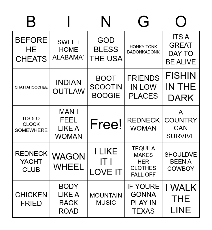This bingo card has a free space and 24 words: WAGON WHEEL, BODY LIKE A BACK ROAD, BOOT SCOOTIN BOOGIE, CHICKEN FRIED, ITS A GREAT DAY TO BE ALIVE, BEFORE HE CHEATS, CHATTAHOOCHEE, SWEET HOME ALABAMA`, REDNECK WOMAN, I LIKE IT I LOVE IT, FRIENDS IN LOW PLACES, ITS 5 O CLOCK SOMEWHERE, TEQUILA MAKES HER CLOTHES FALL OFF, SHOULDVE BEEN A COWBOY, INDIAN OUTLAW, IF YOURE GONNA PLAY IN TEXAS, A COUNTRY CAN SURVIVE, GOD BLESS THE USA, FISHIN IN THE DARK, MAN I FEEL LIKE A WOMAN, I WALK THE LINE, REDNECK YACHT CLUB, HONKY TONK BADONKADONK and MOUNTAIN MUSIC.
