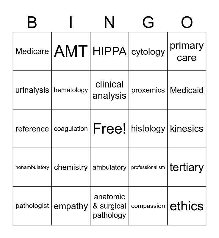 This bingo card has a free space and 24 words: chemistry, empathy, clinical analysis, pathologist, primary care, Medicare, urinalysis, AMT, histology, ambulatory, proxemics, reference, professionalism, tertiary, hematology, compassion, kinesics, HIPPA, Medicaid, coagulation, ethics, nonambulatory, cytology and anatomic & surgical pathology.