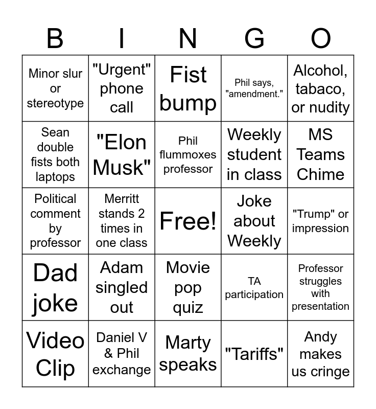 This bingo card has a free space and 24 words: Adam singled out, Daniel V & Phil exchange, Phil flummoxes professor, Video Clip, Alcohol, tabaco, or nudity, Minor slur or stereotype, Sean double fists both laptops, "Urgent" phone call, Joke about Weekly, Movie pop quiz, Weekly student in class, Political comment by professor, TA participation, Professor struggles with presentation, "Elon Musk", "Tariffs", "Trump" or impression, Fist bump, MS Teams Chime, Merritt stands 2 times in one class, Andy makes us cringe, Dad joke, Phil says, "amendment." and Marty speaks.