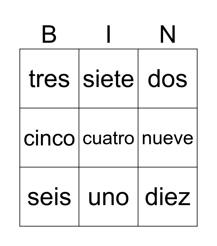 This bingo card has 10 words: uno, dos, tres, cuatro, cinco, seis, siete, ocho, nueve and diez.