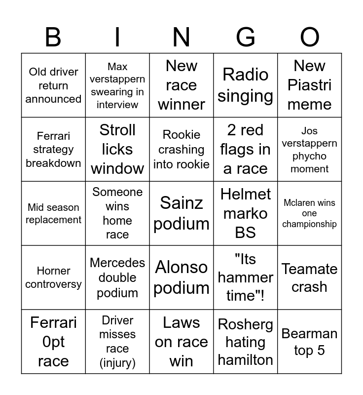 This bingo card has 25 words: Mercedes double podium, Laws on race win, Rookie crashing into rookie, Ferrari 0pt race, New Piastri meme, Old driver return announced, Ferrari strategy breakdown, Max verstappern swearing in interview, Helmet marko BS, Alonso podium, 2 red flags in a race, Mid season replacement, "Its hammer time"!, Teamate crash, Stroll licks window, Bearman top 5, Mclaren wins one championship, New race winner, Jos verstappern phycho moment, Someone wins home race, Sainz podium, Driver misses race (injury), Horner controversy, Radio singing and Rosherg hating hamilton.