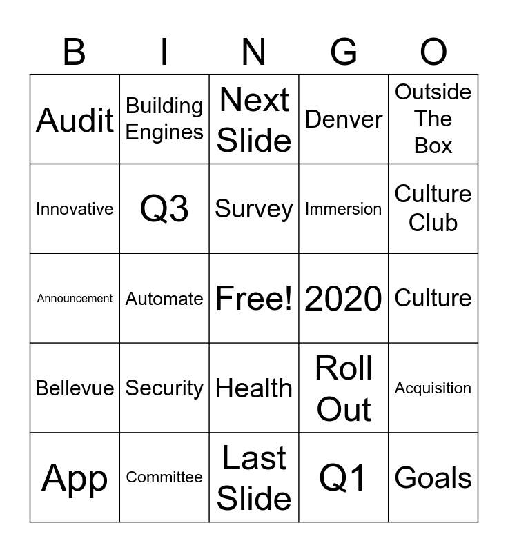 This bingo card has a free space and 66 words: Portfolio, Capital, Million, Acquisition, COI, Cove, Building Engines, Feedback, Survey, Background, Health, Wellness, Culture, Outside The Box, Creative, Innovative, Automate, Audit, UR Brilliant, Immersion, Security, Bellevue, Denver, Portland, Efficiency, Roadmap, Cloud Based, AI, Goals, Tenant, App, Events, Analytics, QR Code, Roll Out, Committee, Baseline, Announcement, Q1, Q2, Q3, Q4, 2020, COVID, Darktrace, Cyber Security, Culture Club, Mindset, Project, ASAP, Downtown, Construction, Develop, Accounting, Coordination, Recycle, Branding, Synergy, Next Slide, Last Slide, Optimize, Return on Investment, Best Practice, Optimize, Leverage and Benchmark.