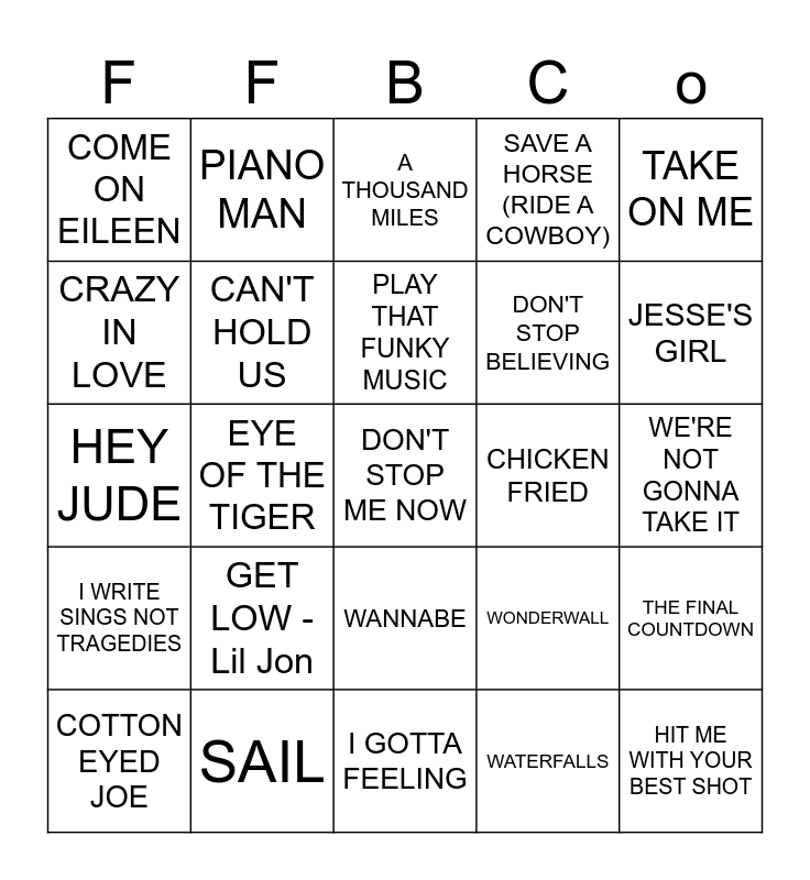 This bingo card has 85 words: (I JUST) DIED IN YOUR ARMS, A BAR SONG (TIPSY), A THOUSAND MILES, AIN'T NO MOUNTAIN HIGH ENOUGH, ALL STAR, AMERICAN PIE, ANY WAY YOU WANT IT, BENNIE & THE JETS, BIG GREEN TRACTOR, BOHEMIAN RHAPSODY, BROWN EYED GIRL, BUILD ME UP BUTTERCUP, CAN'T HOLD US, CHICKEN FRIED, CLOSING TIME, COME ON EILEEN, COTTON EYED JOE, CRAZY IN LOVE, DANCING QUEEN, DANGER ZONE, DIXIELAND DELIGHT, DON'T STOP BELIEVING, DON'T STOP ME NOW, ESCAPE (THE PINA COLADA SONG), EYE OF THE TIGER, FANCY LIKE, FERGALICIOUS, FIREBALL, FOOTLOOSE, FREE BIRD, GET LOW - Lil Jon, GET LOW - FloRida, GIVE ME EVERYTHING, HEY JUDE, HIT ME WITH YOUR BEST SHOT, HOLDING OUT FOR A HERO, I GOTTA FEELING, I WANNA DANCE WITH SOMEBODY, I WRITE SINGS NOT TRAGEDIES, JESSE'S GIRL, JUST A FRIEND, LIVIN' ON A PRAYER, MARGARITAVILLE, MORE THAN A FEELING, MR. BRIGHTSIDE, SWEET CAROLINE, NO SCRUBS, OLD TIME ROCK N ROLL, PARTY IN THE U.S.A., PARTY ROCK ANTHEM, PIANO MAN, PLAY THAT FUNKY MUSIC, POKER FACE, POUR SOME SUGAR ON ME, RED SOLO CUP, RING OF FIRE, SAIL, SAVE A HORSE (RIDE A COWBOY), SHAPE OF YOU, SIMPLE MAN, STACY'S MOM, SUGAR, WE'RE GOIN' DOWN, SWEET HOME ALABAMA, TAKE ME HOME TONIGHT, TAKE ME HOME, COUNTRY ROADS, TAKE ON ME, THE DEVIL WENT DOWN TO GEORGIA, THE FINAL COUNTDOWN, THE FRESH PRINCE OF BEL AIR, THE MIDDLE, THREE LITTLE BIRDS, TIKTOK, TUBTHUMPING, UPTOWN GIRL, WAGON WHEEL, WANNABE, WATERFALLS, WE ARE THE CHAMPIONS, WE ARE YOUNG, WE BUILT THIS CITY, WE'RE NOT GONNA TAKE IT, WHAT I GOT, WHAT'S MY AGE AGAIN, WONDERWALL and YOUR LOVE.