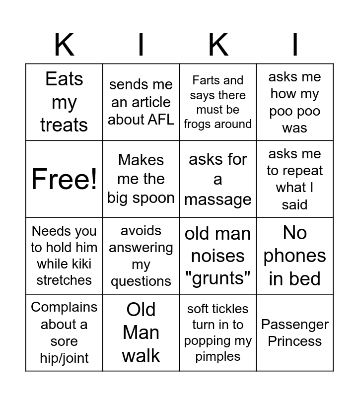 This bingo card has 16 words: Old Man walk, No phones in bed, Farts and says there must be frogs around, Eats my treats, Needs you to hold him while kiki stretches, sends me an article about AFL, old man noises "grunts", soft tickles turn in to popping my pimples, Free!, Makes me the big spoon, Complains about a sore hip/joint, asks me how my poo poo was, avoids answering my questions, asks me to repeat what I said, asks for a massage and Passenger Princess.