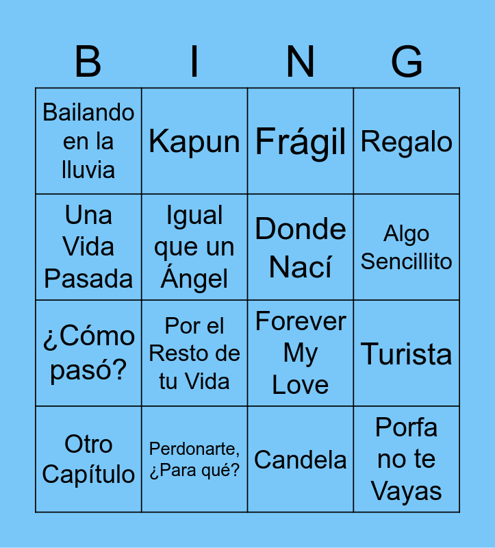 This bingo card has 16 words: Perdonarte, ¿Para qué?, Turista, Frágil, Bailando en la lluvia, ¿Cómo pasó?, Kapun, Forever My Love, Candela, Una Vida Pasada, Igual que un Ángel, Otro Capítulo, Regalo, Por el Resto de tu Vida, Algo Sencillito, Donde Nací and Porfa no te Vayas.