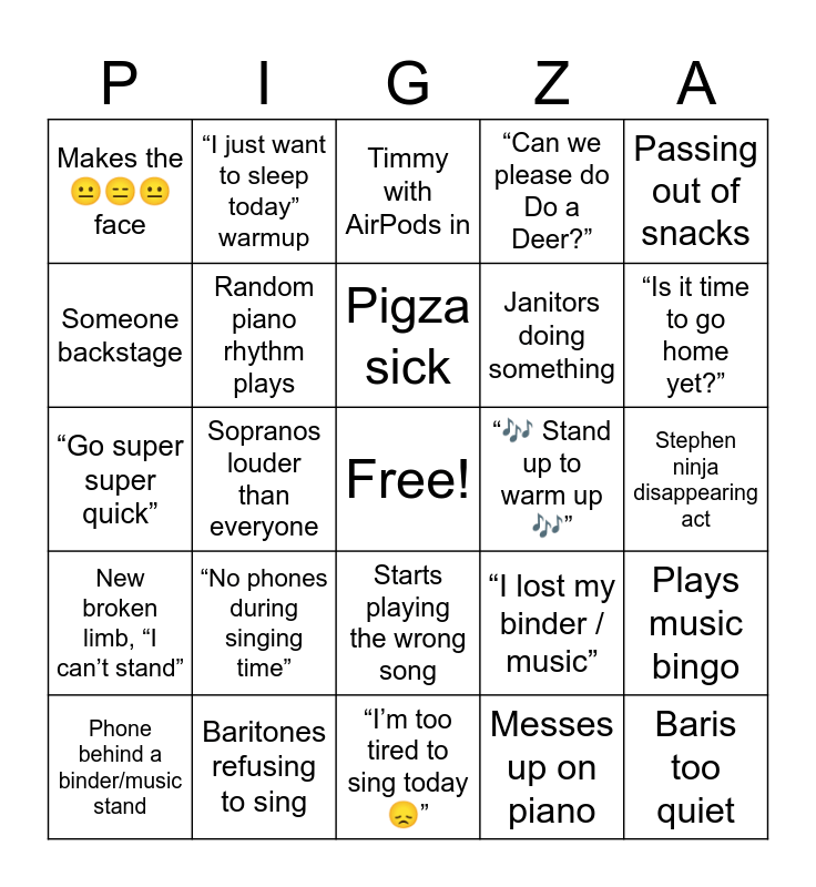 This bingo card has a free space and 29 words: Phone behind a binder/music stand, Altos off key, Sopranos louder than everyone, Compares to 7th graders, Makes the ๐๐๐ face, Timmy with AirPods in, Random piano rhythm plays, โNo phones during singing timeโ, โ๐ถ Stand up to warm up ๐ถโ, Baritones refusing to sing, Stephen ninja disappearing act, Baris too quiet, โIโm too tired to sing today ๐โ, Messes up on piano, โIs it time to go home yet?โ, โCan I got to the restroomโ, Starts playing the wrong song, New broken limb, โI canโt standโ, Passing out of snacks, โGo super super quickโ, โI lost my binder / musicโ, Stranger lurking in the shadows, Janitors doing something, Someone backstage, โCan we please do Do a Deer?โ, โI just want to sleep todayโ warmup, Plays music bingo, Pigza sick and Pigza forgets the words.