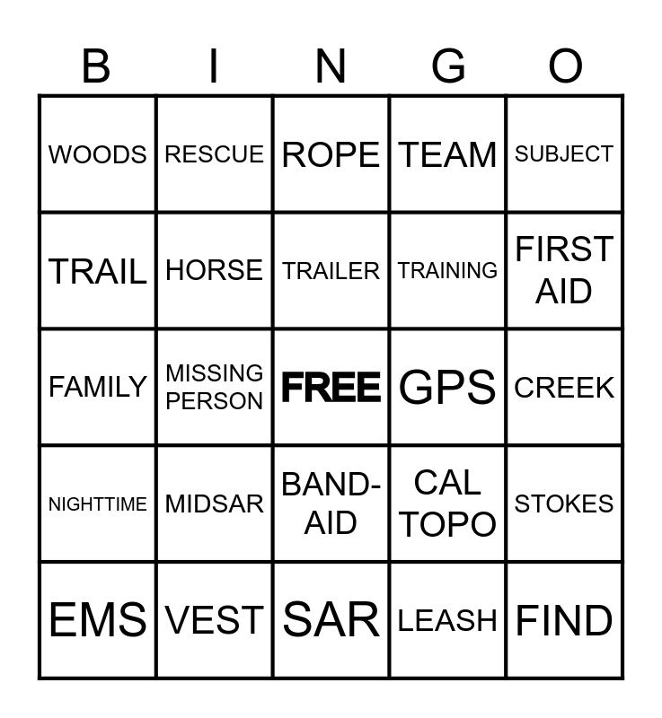 This bingo card has a free space and 50 words: K-9, FIND, HANDLER, SAR, MIDSAR, SEARCH, RESCUE, HIGH FIND, TRAIL, AIR SCENT, HORSE, TEAM, STOKES, CAL TOPO, SIGNAL, MAP, TRAILER, GPS, COORDINATES, SUBJECT, MISSING PERSON, LEASH, WOODS, TRAINING, REFLECTIVE TAPE, BLUE LIGHT, FIRST AID, PACK, ROPE, BAND-AID, WOUND, WATER, ORANGE, HEAD LAMP, VEST, CAPTAIN, LIEUTENANT, CHIEF, BUG SPRAY, CREEK, HARNESS, SCENT ARTICLE, POLICE, FIRE, EMS, FAMILY, PUBLIC SERVICE, BACKPACK, NIGHTTIME and AWARENESS.