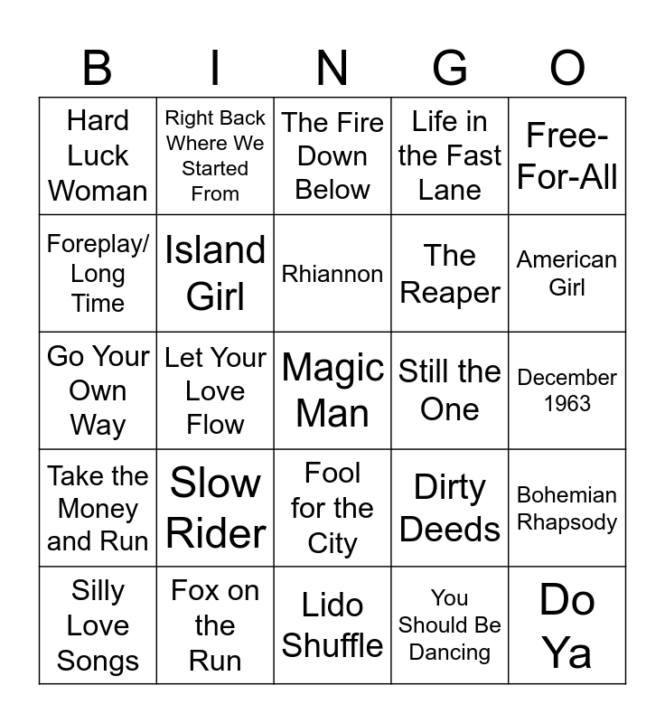 This bingo card has 25 words: Slow Rider, Lido Shuffle, Rhiannon, Silly Love Songs, Free-For-All, Hard Luck Woman, Foreplay/ Long Time, Right Back Where We Started From, Still the One, Fool for the City, The Reaper, Go Your Own Way, Dirty Deeds, Bohemian Rhapsody, Island Girl, Do Ya, December 1963, The Fire Down Below, American Girl, Let Your Love Flow, Magic Man, Fox on the Run, Take the Money and Run, Life in the Fast Lane and You Should Be Dancing.