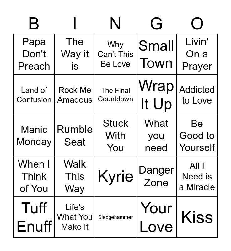 This bingo card has 25 words: Walk This Way, Sledgehammer, The Final Countdown, Tuff Enuff, Livin' On a Prayer, Papa Don't Preach, Land of Confusion, The Way it is, What you need, Kyrie, Wrap It Up, Manic Monday, Danger Zone, All I Need is a Miracle, Rock Me Amadeus, Kiss, Be Good to Yourself, Why Can't This Be Love, Addicted to Love, Rumble Seat, Stuck With You, Life's What You Make It, When I Think of You, Small Town and Your Love.