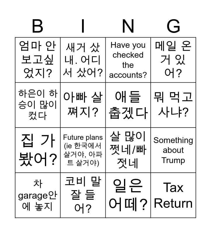 This bingo card has 16 words: 코비 말 잘 들어?, Something about Trump, Have you checked the accounts?, 엄마 안 보고싶었지?, 집 가봤어?, 새거 샀내. 어디서 샀어?, 살 많이 쩟네/빠젓네, 일은 어떼?, 하은이 하승이 많이 컸다, 아빠 살 쪄지?, 차 garage안에 놓지, 메일 온거 있어?, Future plans (ie 한국에서 살거야, 아파트 살거야), 뭐 먹고 사냐?, 애들 춥겠다 and Tax Return.