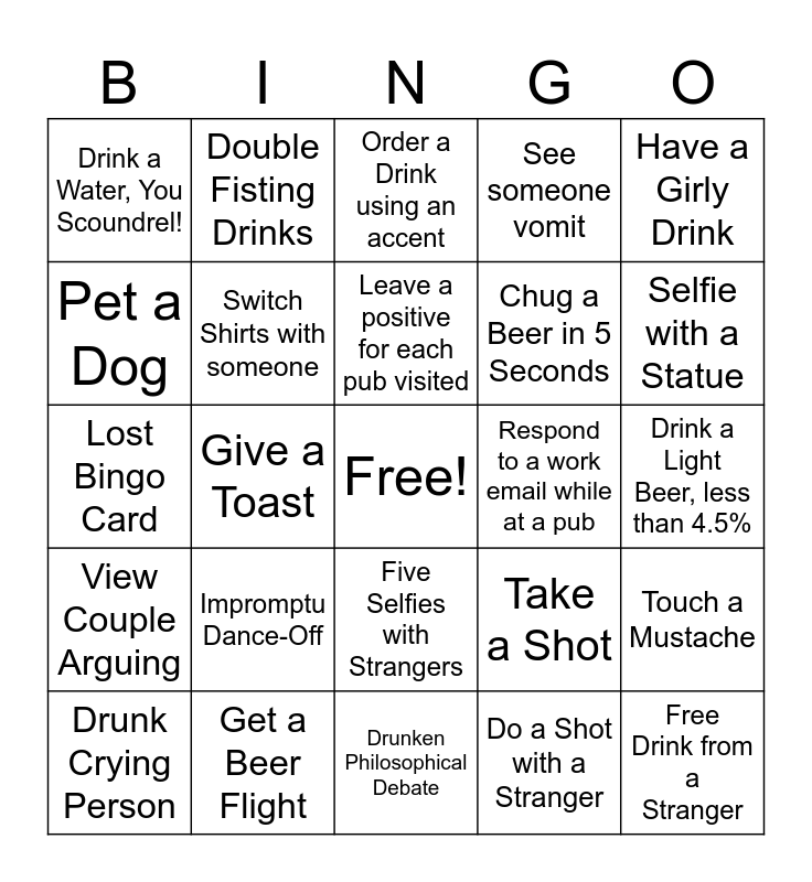 This bingo card has a free space and 50 words: Get a Drink Named After You, Free Drink from a Stranger, Mystery Shot, Drunken Philosophical Debate, Impromptu Dance-Off, Signature Dance Move, Double Fisting Drinks, Do Karaoke, Pet a Dog, Selfie with the Bartender, Switch Shirts with someone, See someone vomit, Touch a Mustache, Take a Shot, Take a Group Photo, Drink a Jameson Cocktail, Leave a positive for each pub visited, Respond to a work email while at a pub, Get Digits, Have a Girly Drink, Give a Toast, Do a Shot with a Stranger, Drink a Water, You Scoundrel!, Chug a Beer in 5 Seconds, Play a song on Touch Tunes, Collect 5 Branded Napkins, Selfie with a Statue, Selfie w/ a Police Officer, Order a Drink using an accent, Five Selfies with Strangers, Start a USA Chant, Find Money on the Ground, Get others to sing a song you spontaneously started, Find the number 23, Get a Beer Flight, Get a Drink on the House, View someone napping, Drink a Stout, Do 10 Pushups inside the Bar, Drink a Light Beer, less than 4.5%, Glass Breaks, Spot the Mullet, Pic of Loner at the end of the Bar, Spot Visible Underwear (other people), Drunk Crying Person, Lost Bingo Card, Make it to 5 Pubs, See someone drunk before the 3rd pub, View Couple Arguing and View someone wearing College Shirt.