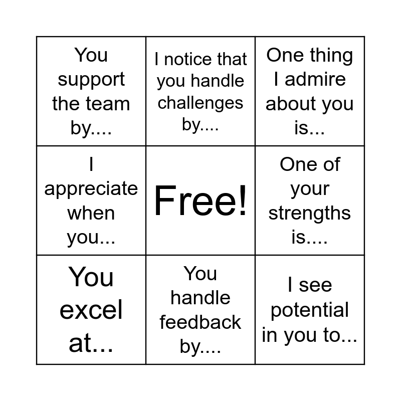This bingo card has a free space and 8 words: I appreciate when you..., I notice that you handle challenges by...., One of your strengths is...., You excel at..., One thing I admire about you is..., You support the team by...., You handle feedback by.... and I see potential in you to....