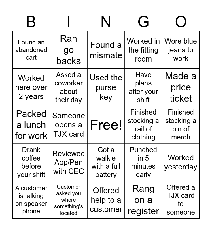 This bingo card has a free space and 29 words: A customer is talking on speaker phone, Price check is called, Someone opens a TJX card, You told someone "good job", Found an abandoned cart, Found a mismate, Asked a coworker about their day, Reviewed App/Pen with CEC, Finished stocking a rail of clothing, Customer asked you where something's located, Finished stocking a bin of merch, Offered a TJX card to someone, Offered help to a customer, Rang on a register, Made a price ticket, Thanked a customer for shopping, Got a walkie with a full battery, Drank coffee before your shift, Wore blue jeans to work, Packed a lunch for work, Punched in 5 minutes early, Saw a dog in the store, Have plans after your shift, Worked here over 2 years, Worked in the fitting room, Ran go backs, Worked yesterday, Used the purse key and Opened the perfume case.