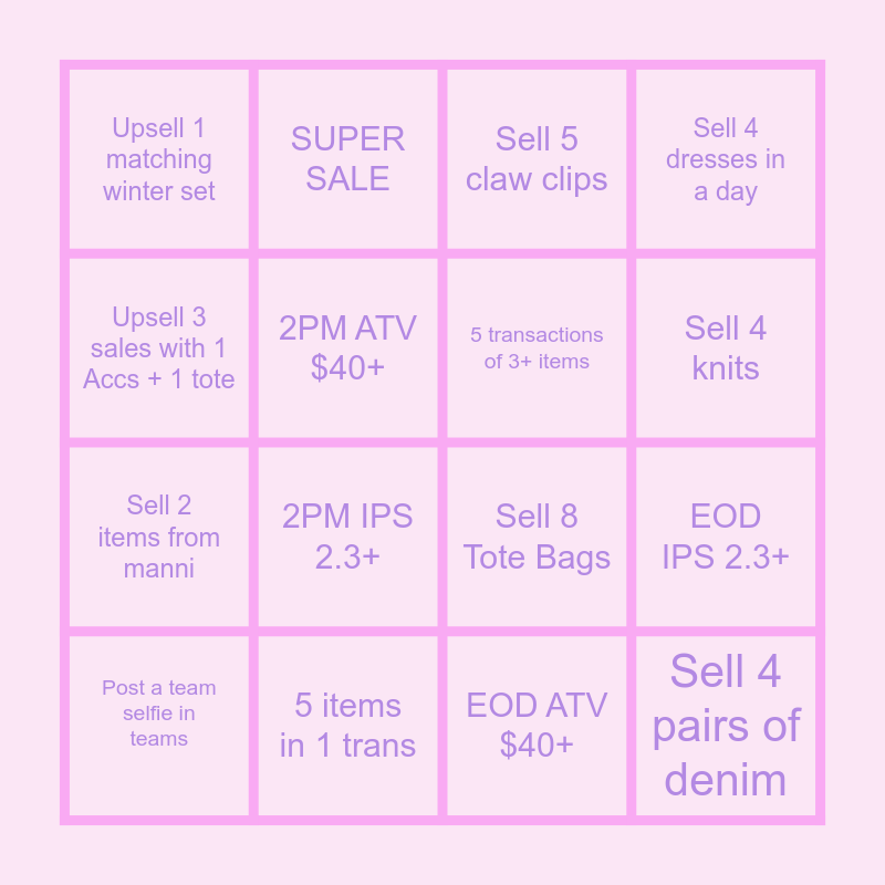 This bingo card has 16 words: 5 items in 1 trans, EOD IPS 2.3+, Sell 5 claw clips, Upsell 1 matching winter set, Sell 2 items from manni, SUPER SALE, Sell 8 Tote Bags, EOD ATV $40+, Upsell 3 sales with 1 Accs + 1 tote, 2PM ATV $40+, Post a team selfie in teams, Sell 4 dresses in a day, 2PM IPS 2.3+, Sell 4 knits, 5 transactions of 3+ items and Sell 4 pairs of denim.