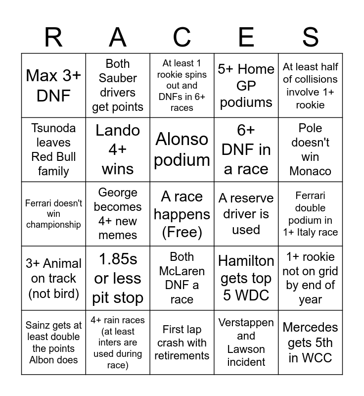 This bingo card has a free space and 24 words: 1.85s or less pit stop, 4+ rain races (at least inters are used during race), Alonso podium, Sainz gets at least double the points Albon does, At least half of collisions involve 1+ rookie, Max 3+ DNF, Tsunoda leaves Red Bull family, Both Sauber drivers get points, A reserve driver is used, Both McLaren DNF a race, 6+ DNF in a race, Ferrari doesn't win championship, Hamilton gets top 5 WDC, 1+ rookie not on grid by end of year, Lando 4+ wins, Verstappen and Lawson incident, Ferrari double podium in 1+ Italy race, At least 1 rookie spins out and DNFs in 6+ races, Pole doesn't win Monaco, George becomes 4+ new memes, Mercedes gets 5th in WCC, 3+ Animal on track (not bird), 5+ Home GP podiums and First lap crash with retirements.