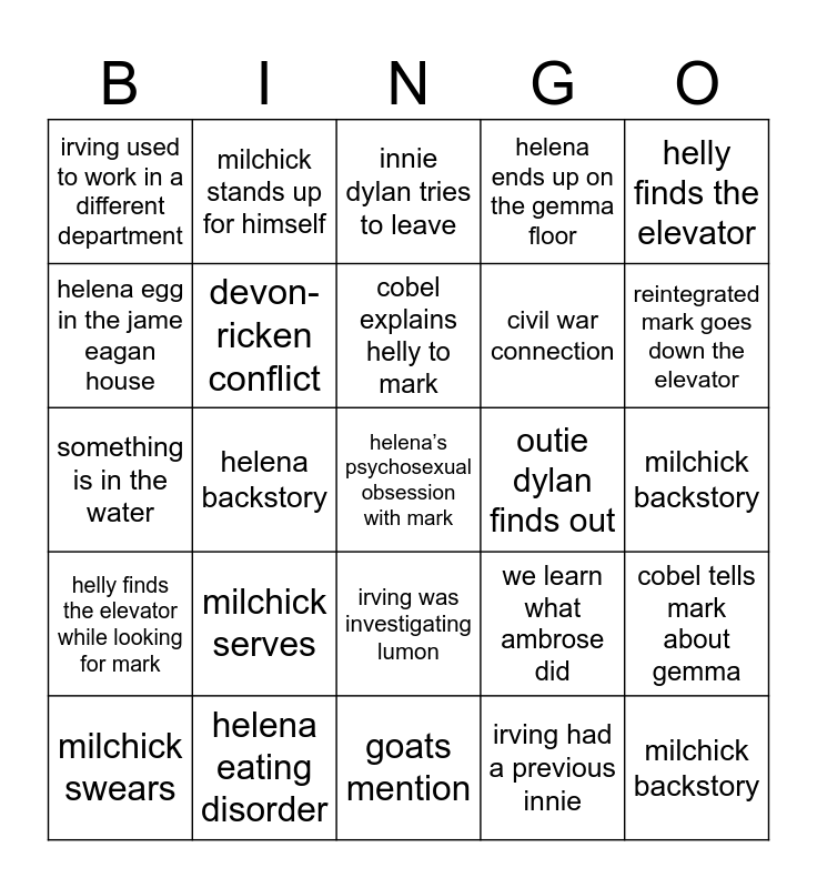 This bingo card has a free space and 24 words: milchick serves, helena eating disorder, cobel explains helly to mark, milchick swears, helly finds the elevator, irving used to work in a different department, helena egg in the jame eagan house, milchick stands up for himself, outie dylan finds out, irving was investigating lumon, civil war connection, something is in the water, we learn what ambrose did, cobel tells mark about gemma, devon-ricken conflict, irving had a previous innie, milchick backstory, innie dylan tries to leave, reintegrated mark goes down the elevator, helena backstory, milchick backstory, helly finds the elevator while looking for mark, helena ends up on the gemma floor and goats mention.