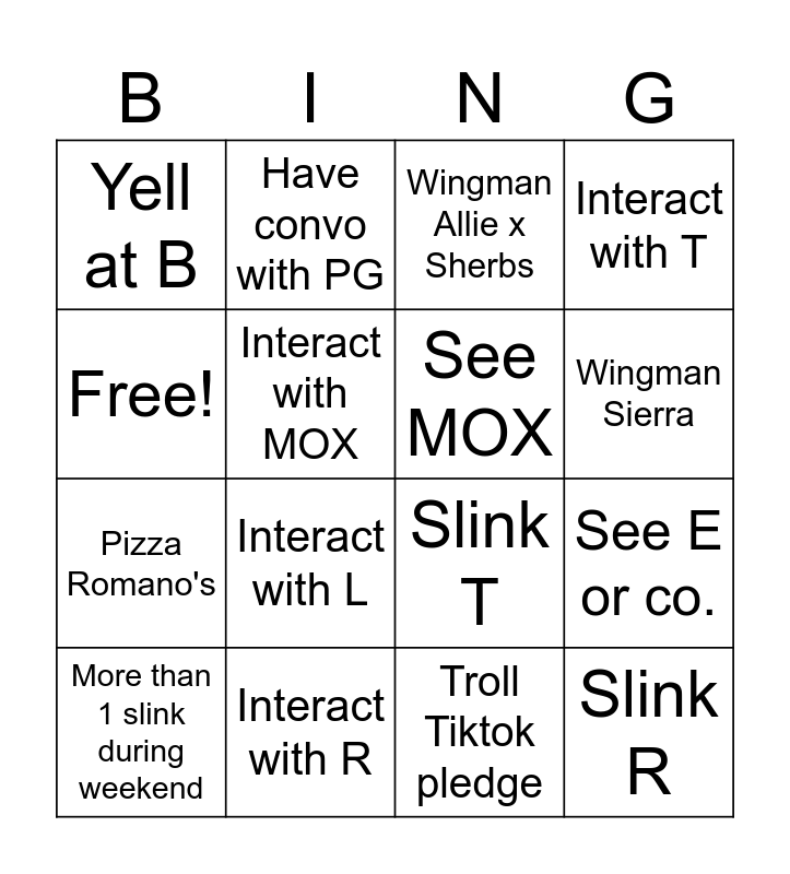 This bingo card has 16 words: Interact with R, See E or co., Wingman Allie x Sherbs, Yell at B, Pizza Romano's, Have convo with PG, Slink T, Troll Tiktok pledge, Free!, Interact with MOX, More than 1 slink during weekend, Interact with T, Interact with L, Wingman Sierra, See MOX and Slink R.