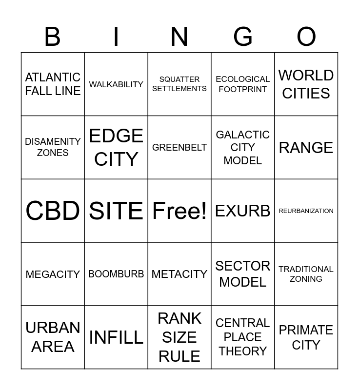 This bingo card has a free space and 29 words: URBAN AREA, METROPOLITAN AREA, SITE, SITUATION, ATLANTIC FALL LINE, SQUATTER SETTLEMENTS, EDGE CITY, BOOMBURB, EXURB, INFILL, REURBANIZATION, PRIMATE CITY, RANK SIZE RULE, CENTRAL PLACE THEORY, RANGE, THRESHOLD, METACITY, MEGACITY, WORLD CITIES, CBD, SECTOR MODEL, NODES, GALACTIC CITY MODEL, DISAMENITY ZONES, ECOLOGICAL FOOTPRINT, WALKABILITY, TRADITIONAL ZONING, GREENBELT and REDLINING.