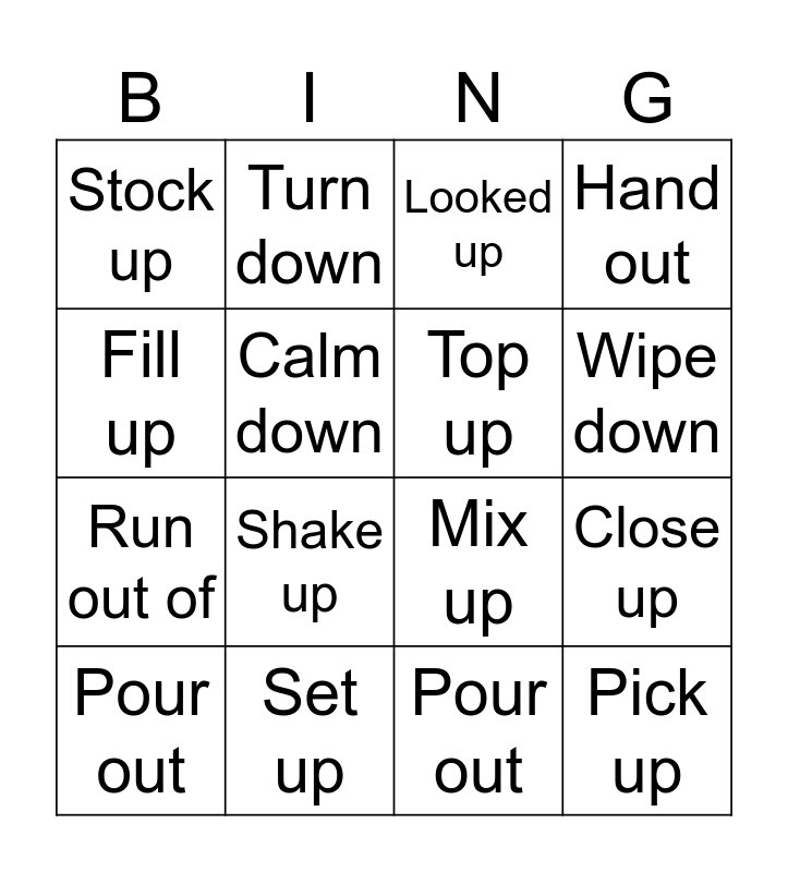 This bingo card has 16 words: Set up, Close up, Looked up, Stock up, Run out of, Turn down, Mix up, Pour out, Fill up, Calm down, Pour out, Hand out, Shake up, Wipe down, Top up and Pick up.