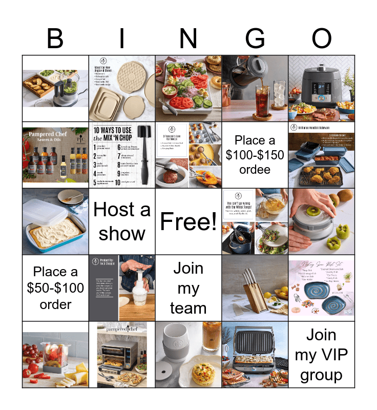 This bingo card has 19 images, a free space and 5 words: Place a $50-$100 order, Host a show, Join my team, Place a $100-$150 ordee and Join my VIP group.
