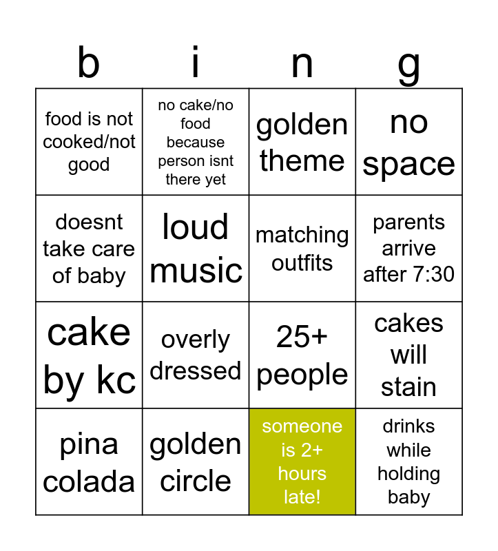 This bingo card has 16 words: golden circle, cakes will stain, golden theme, food is not cooked/not good, cake by kc, no cake/no food because person isnt there yet, 25+ people, someone is 2+ hours late!, doesnt take care of baby, loud music, pina colada, no space, overly dressed, parents arrive after 7:30, matching outfits and drinks while holding baby.