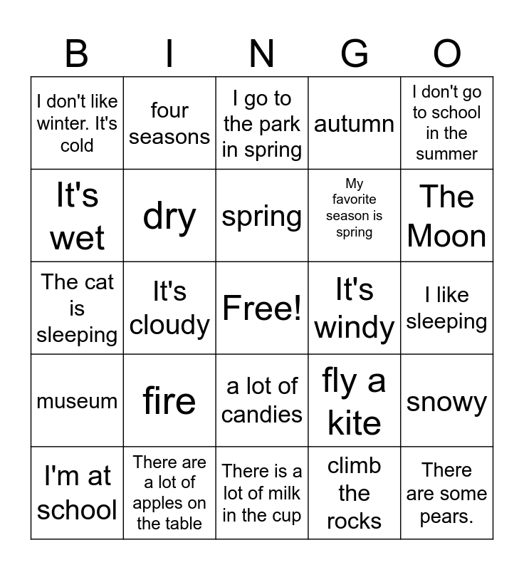 This bingo card has a free space and 24 words: fire, There are a lot of apples on the table, spring, I'm at school, I don't go to school in the summer, I don't like winter. It's cold, It's wet, four seasons, It's windy, a lot of candies, My favorite season is spring, The cat is sleeping, fly a kite, snowy, dry, climb the rocks, I like sleeping, I go to the park in spring, The Moon, It's cloudy, There are some pears., museum, autumn and There is a lot of milk in the cup.