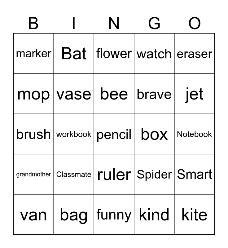 This bingo card has 25 words: Classmate, funny, bee, van, eraser, marker, mop, Bat, box, ruler, brave, brush, Spider, Smart, vase, kite, Notebook, flower, jet, workbook, pencil, bag, grandmother, watch and kind.