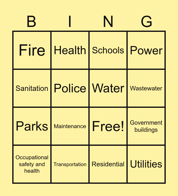This bingo card has 22 words: Transportation, Waste management, Health, Education, Police, Water, Fire, Schools, Free!, Utilities, Parks, Power, Public transportation, Recreation Center, Residential, Bicycle infrastructure, Government buildings, Occupational safety and health, Maintenance, Sanitation, Wastewater and What are urban public services.